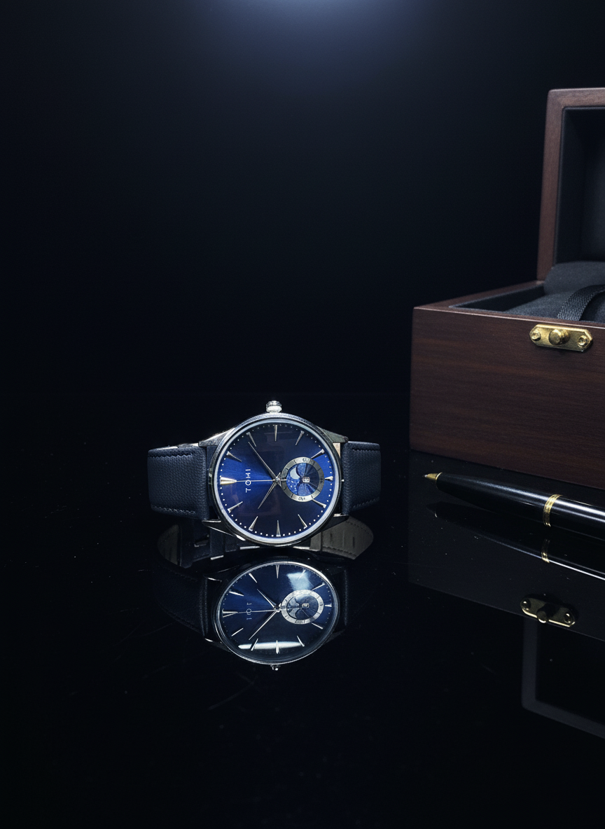 The TOMI Magnet Classic blends refined sophistication with practical innovation. Featuring a sleek moonphase dial and a smooth magnetic leather strap, it’s crafted for those who appreciate both timeless design and everyday convenience. With its minimalist detailing and reliable quartz precision, this watch is a perfect expression of modern elegance — a collaboration between Timeless Aura and TOMI Watches.